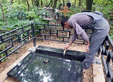 Клиент заказал у нас комплексное оформление места захоронения, в которое входят: классический горизонтальный памятник из чёрного гранита с прямоугольным цветником, простая металлическая оградка, а также наземное покрытие места захоронения гранитной брусчаткой. В первый наш приезд на кладбище могила выглядела следующим образом: два деревянных крестика и простое ограждение.